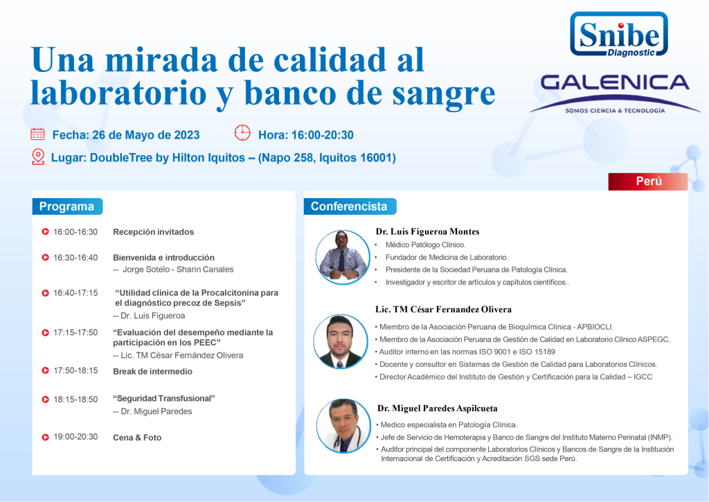 Este viernes 26 de mayo desde las 16:00 hrs. En el Hotel DoubleTree by Hilton Iquitos, se desarrollará nuestro Workshop en colaboración de nuestra representada Snibe Diagnostic, en esta ocasión, abordaremos distintos temas de interés para profesionales de Laboratorios Clínicos y Bancos de Sangre.